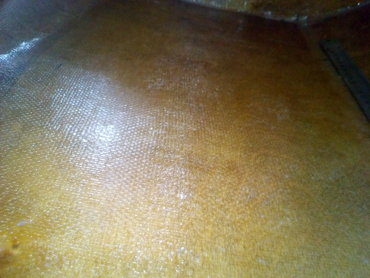 Не скрою - давил сильно. Смолу наносил сначала на фанеру, потом поверх стекла. На фанеру наносил кистью, а после - растаскивал шпателем. Поверх ткани лил из тары и растаскивал шпателем. К моменту укладки ткани смола во многих местах пропитала фанеру до состояния, что пальцы не прилипали. Соответственно в этих местах ткань пропитывалась дольше.