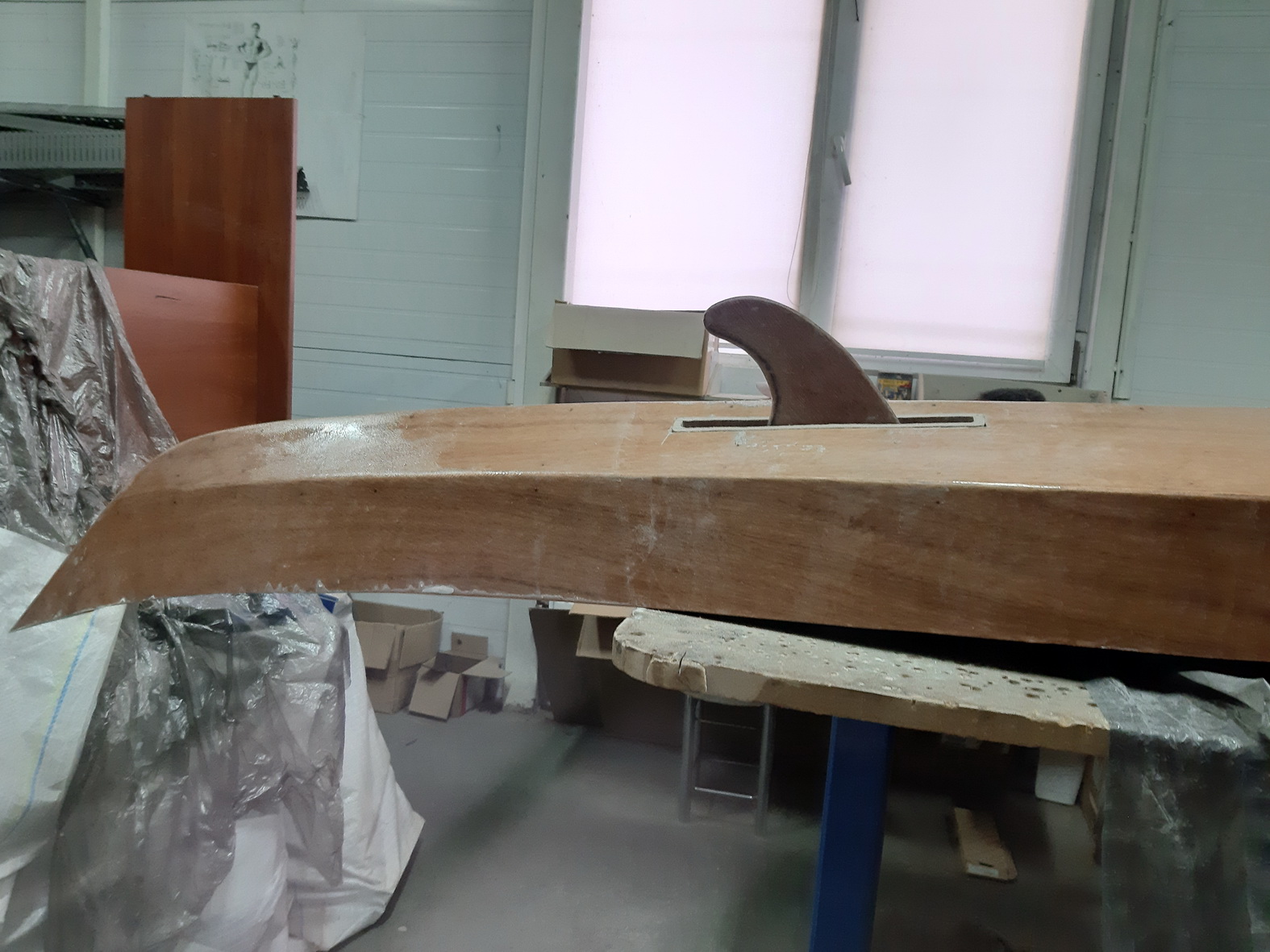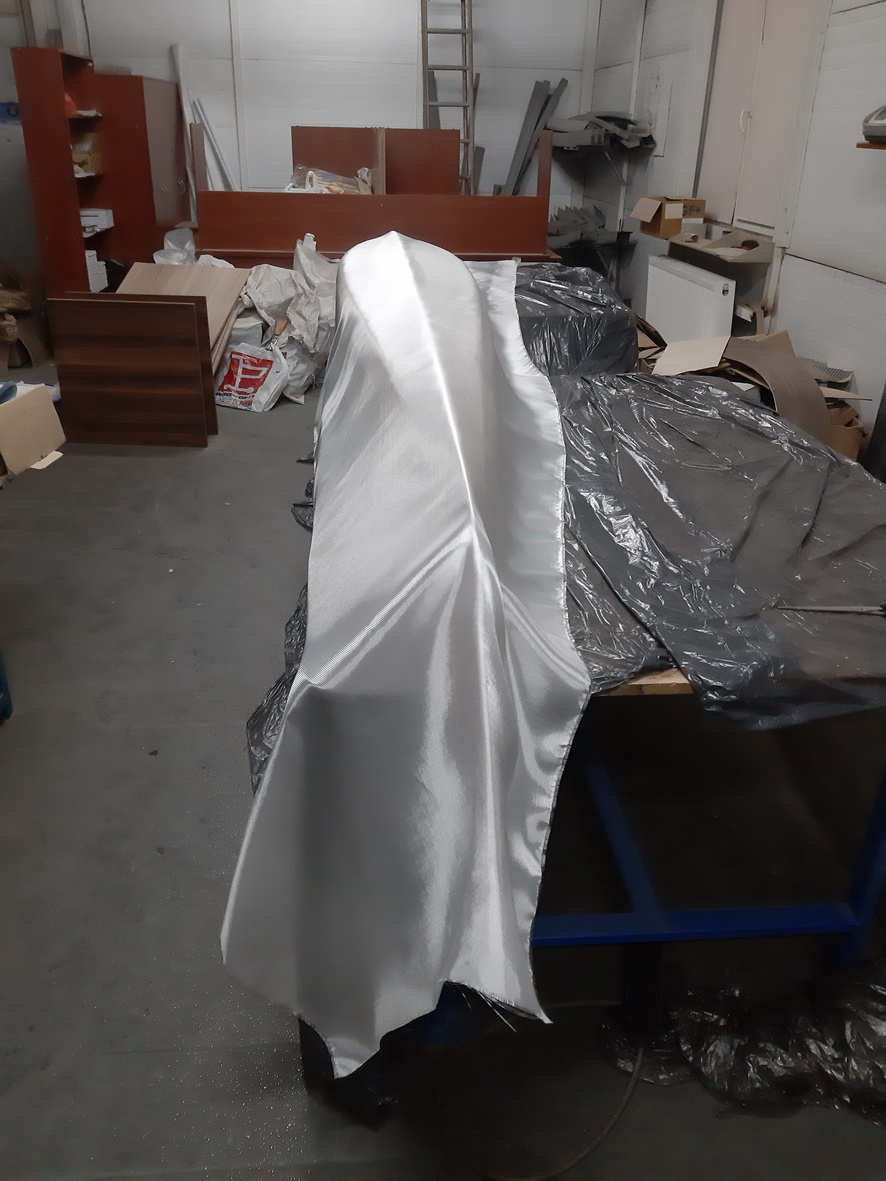 Оклеен снаружи корпус, и сразу же через 12 часов нанесение заполняющего слоя. Его нужно будет еще скорректировать, но уже выглядит эффектно. Выкладывал ткань по диагонали, как рекомендует Ник Шаде, это позволило получить большие куски при обрезке, диагональная укладка «bias cut» якобы лучше огибает контуры. Из минусов – перестарался при обрезке излишков, на носу и корме немного не хватило ткани, поэтому пришлось накрывать нос и корму отдельными кусками поверх основного слоя, благо большие куски оставались. Ткань 100 г/м2, плетение саржа, нахлест после заполняющего слоя не бросается в глаза.