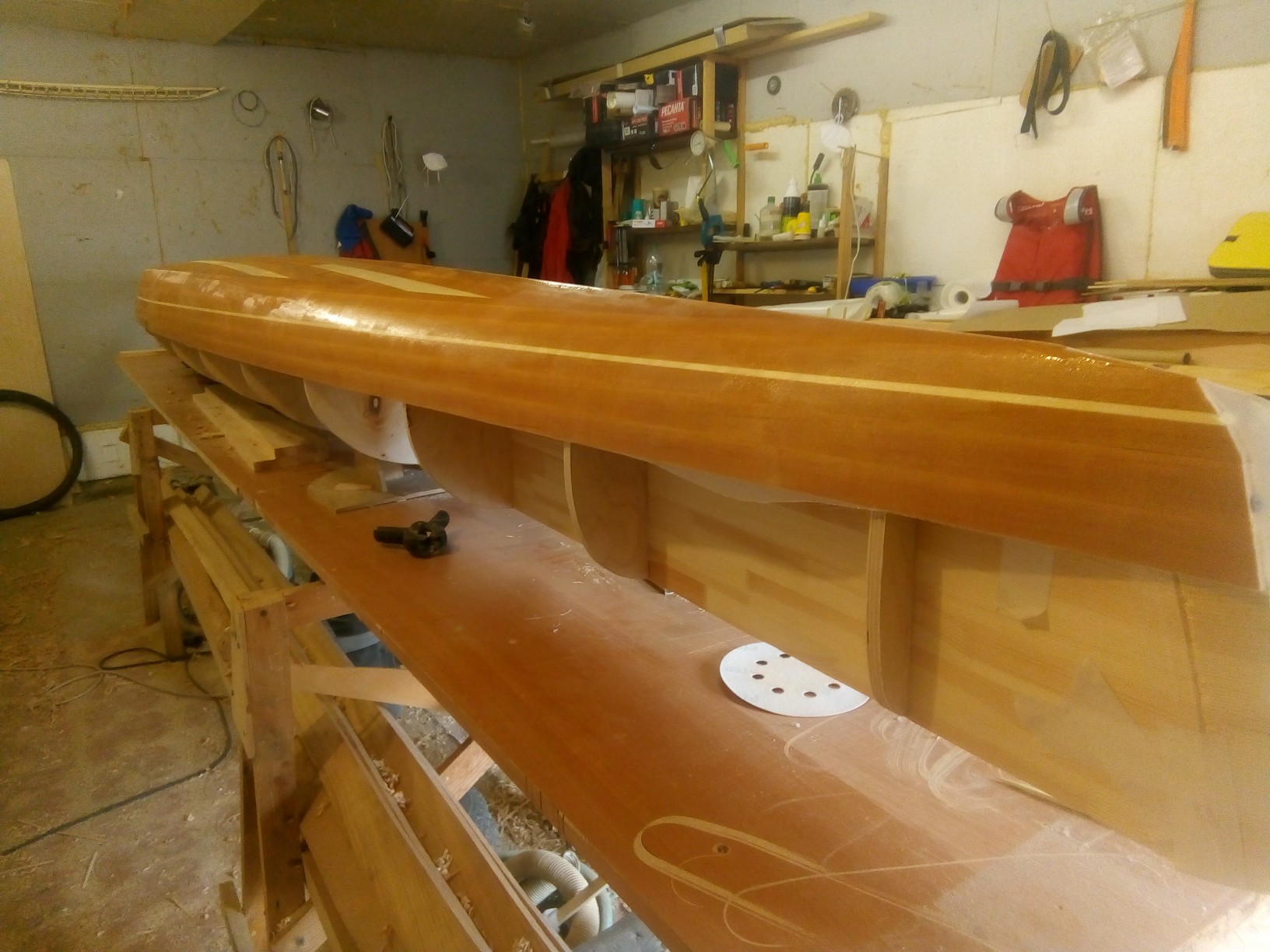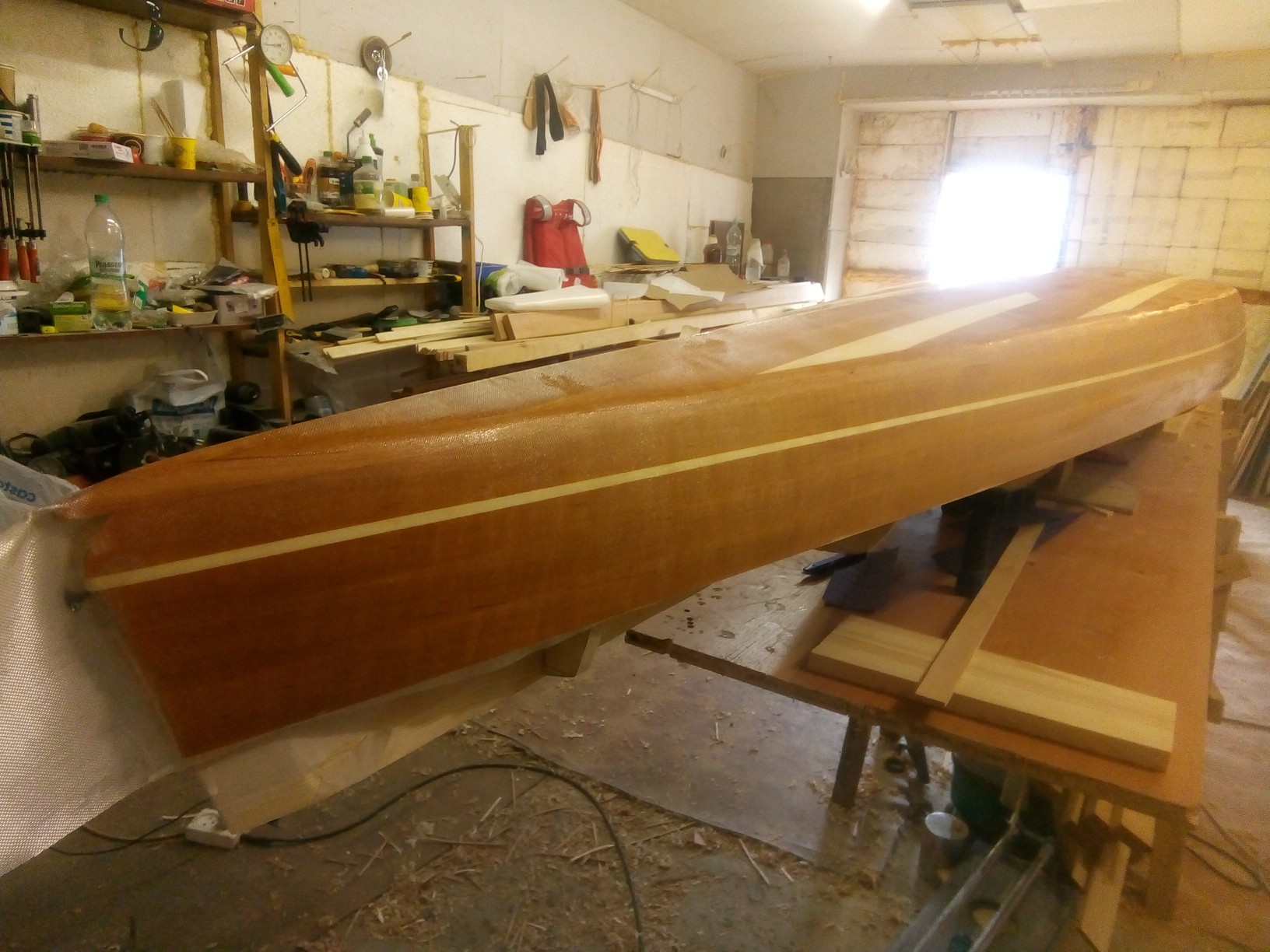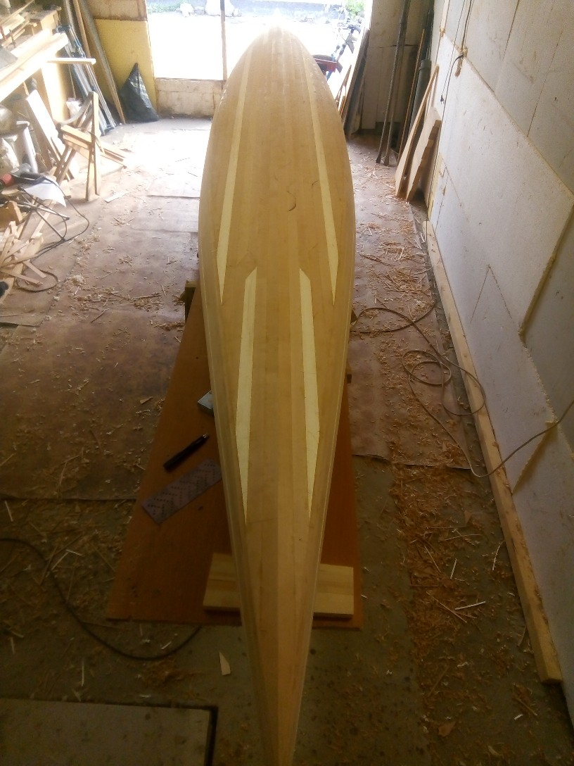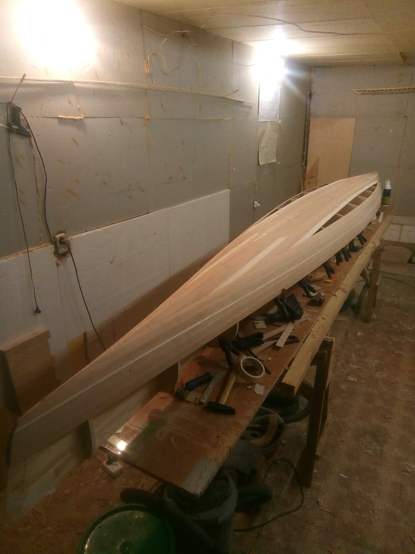 Ламинация с тканью. На краях корпуса (нос корма) видны края ткани. По низу обрезал сразу-морщинилась, отслаивалась. Ламинировать при реечной технологии нужно все плоскости со всех сторон. Пара склеенных реек это не кусок фанеры. Слабы на излом вдоль волокон.