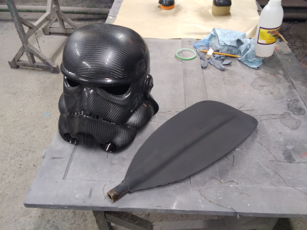 У меня на фото эпоксидка с мраморной пылью ( микрокальцит) и серебрянка. Эпоксидного геля нет, а матрица будет эпоксидная, потому что потом изделие надо будет прожаривать. Задача с этой лопаткой не повторить Лэтмана, а сделать из стеклопластика максимально возможное по прочности изделие. Можно взять очень качественные и дорогие материалы и получить от них только половину возможностей, а можно взять по проще, гораздо дешевле и выжать максимум. Вот этим и занимаюсь. Поэтому вакуум, термостатирование....
