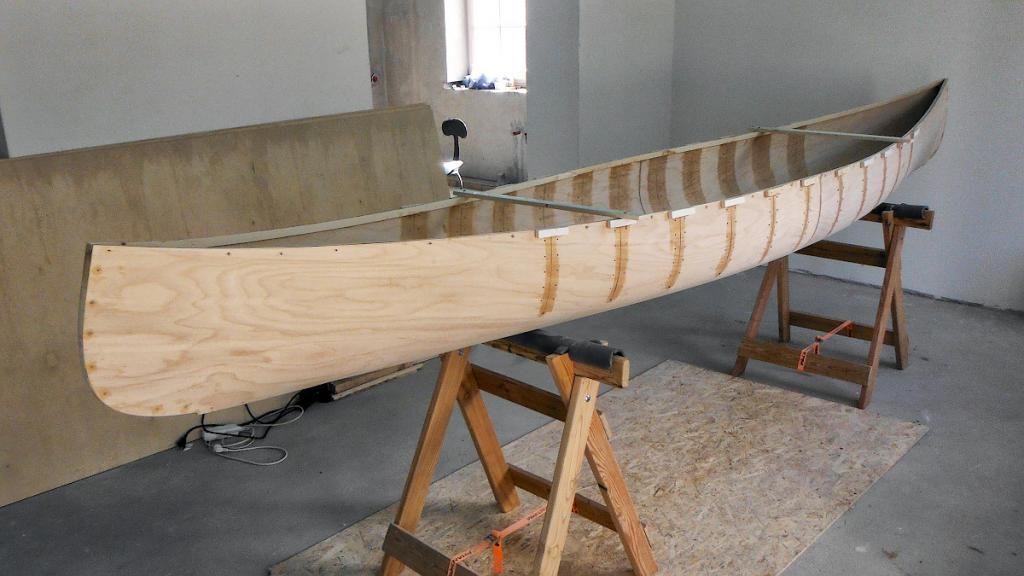 Корпус канадского каноэ по методу ФЛО - МО. Ниже бортовых надрезов фанерное дно приобрело двойную кривизну просто потому, что его изнасиловали. Для пакета же шпона это вообще без проблем. Двойная кривизна выше ВЛ для узкого и низкобортного спортивного каяка сов. необязательна, одинарной вполне достаточно.