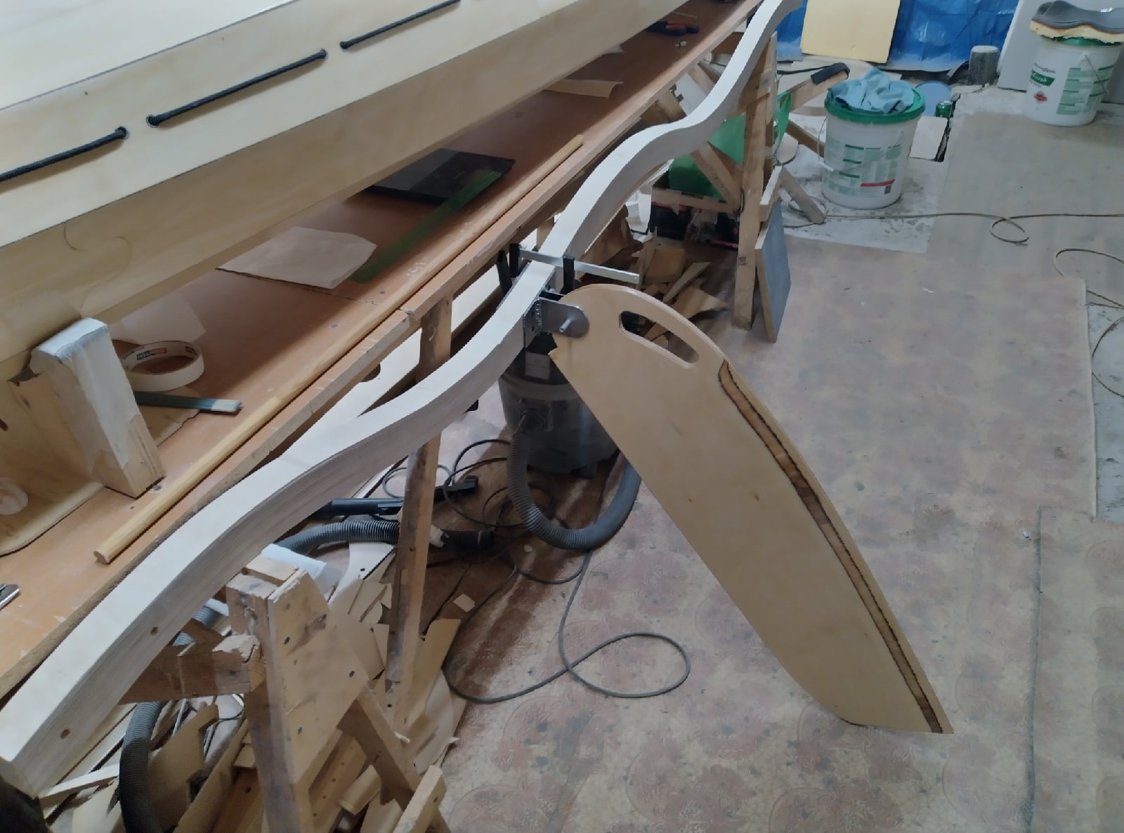 Еще один момент, переднюю балку - неплохо было бы сдвинуть максимально вперед, для того чтоб можно было комфортнее грести (рекомендую попробовать сесть в лодку с веслом сейчас и прикинуть как оно). Возможно, крепление мачты - удобнее будет завязать на поперечную балку, а не на корпус каяка