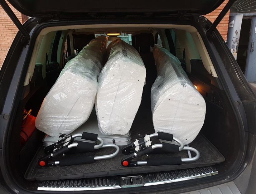 Подвеска руля - такая же, как была раньше (на фото - подвеска на Аделаиде, на Кортике аналогичная, но с другим типом крепления к корпусу - на металлической скобе, крепимой 4 винтами к закладному элементу в корпусе) Люки - как в модели 2019г - специальный конический профиль достаточно широкой горловины и вставка из пористой резины EPDM на внутренней поверхности люков гермоотсеков обеспечивают их высокую герметичность. Крепление - см. фото. В отличие от обычных китайских люков - очень быстро одевается и снимается и надежно прижимается эластичным шнуром, натяжение которого можно регулировать. Что касается микро-гермоотсека - то тут ситуация непростая: я напоминаю, что в отличие от всех остальных каяков на российском рынке - Кортик с самого начала делался с возможностью разборки на секции, что дает массу бонусов в транспортировке (а также в возможности хранения в городской квартире): а) возможность перевозить внутри авто (см. фото),