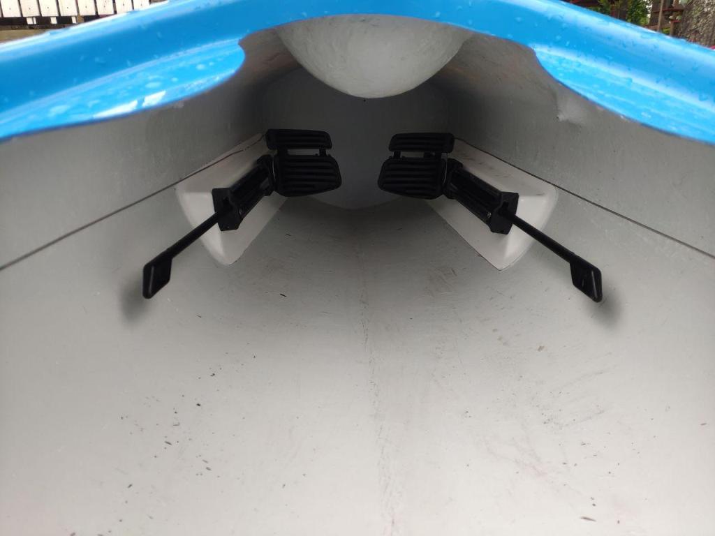 Упоры-рулевые педали совмещенные, с автонастройкой натяжения, тросиковый привод, железный трос чем-то ламинирован, удобно регулировать сидя в лодке уже на воде.