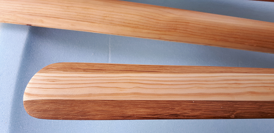 Сделано несколько весел. Каждый раз оболочка тоньше, слоев ткани больше-сейчас 3 слоя. Что на фото-край дуб, середина сосна, толщина оболочки дерева 3.5-4 мм, 3 слоя Т15 полой 160-й ткани. По габаритам на 2 мм увеличил весло. Вес 750 гр, взвешивал после сразу после фрезеровки, без среза наплывов креплений. Осталось испытать. Весло с фото буду долго мочить в воде, вскрывать и ломать. Посмотрим на результат испытаний. И тогда наверно будет серия. В июне штук 20-30.