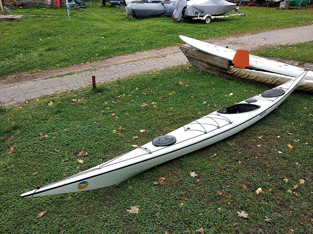 Чистокровный гренландский каяк. Длина 545 см, Ширина 52 см. Вес 24 кг. Стеклопластик. Куплен в июле 2019, ходил неделю на Ладоге и раз 7-8 на Пироговском вдхр. Состояние отличное. Были незначительные потертости на левом борту (отрабатывал storm roll с карбоновым веслом) и в районе скега (камешек на Ладоге). Теперь нет - заполировал. Царапинки остались только на наклейке с логотипом. Эти места видны на фото. В остальном как новый. Все три люка совершенно герметичные. Лодка быстрая, очень маневренная и мореходная. Эскимосский переворот, как легко догадаться, делается элементарно. Вообще для обучения всем эскимосским премудростям очень хорошо подходит.