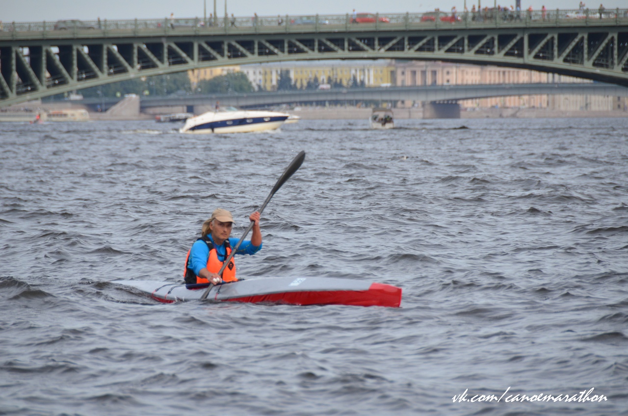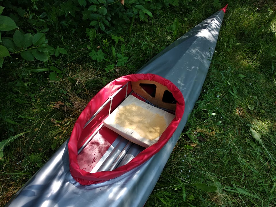 Самодельная каркасно-надувная байдарка для гонок и тренировок. Длина 620 см, ширина 50 см, вес 13 кг. Сделана этим летом. Была на воде всего несколько раз. На днях выиграла Петровский марафон (68 км по Неве) в классе разборных одиночек и была второй среди всех одиночек. Разбирается на две части (длина пенала немного больше 3 метров). Но можно легко переделать в вариант длиной 1.6 метров. Собирается за 40 минут.