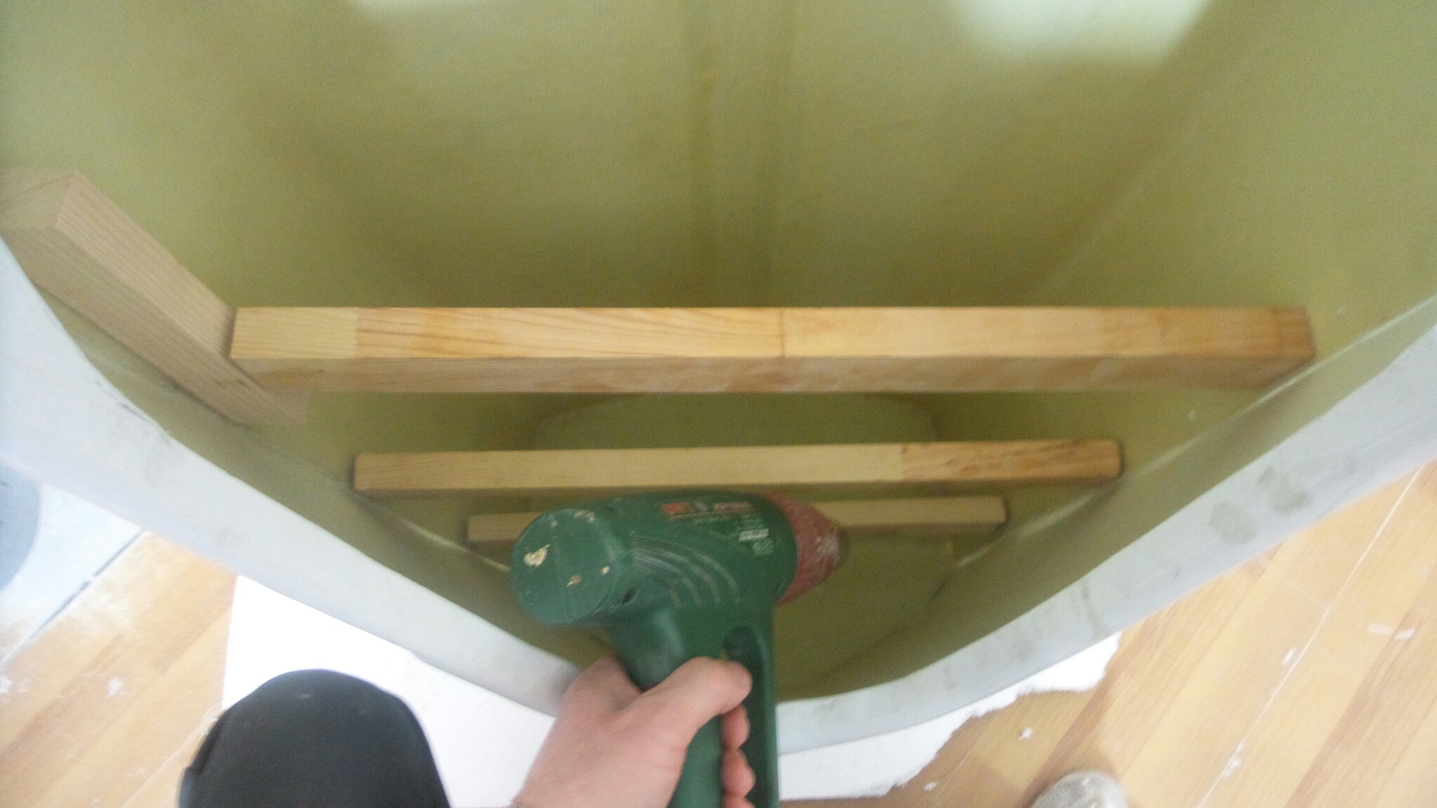 Обрезал лишнюю ткань с торца. Вроде как неплохо. Одна печаль - вес все растет и растет( Перевернул корпус и проклеил изнутри. Пришлось поиграться под спинкой, руку с трудом разворачивал. После оклеил передний торец, прогревал смолу лампами - неплохой ночник вышел)