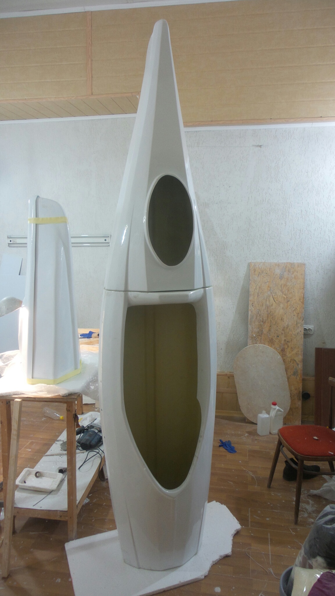 Поправил геометрию средней части. Опять прогрел изнутри феном и поставил распорки - супер! Все стало на место. Проверил геометрию носовой и кормовой части с получившимся кокпитом. Чуть подправил и начал склейку. Склеил носовую часть. Тут все просто она не разборная. Вот с кормовой пришлось вклеить с торца кусок пластика что бы поднять выше ту часть что будет соответствовать по высоте носовой части. Срезал часть крышки. Мне даже так больше нравится. Приклеил пластик с торцом кормы эпоксидкой. Посмотрю что завтра выйдет. После изнутри армирую стеклом и начну вклейку крепежа.