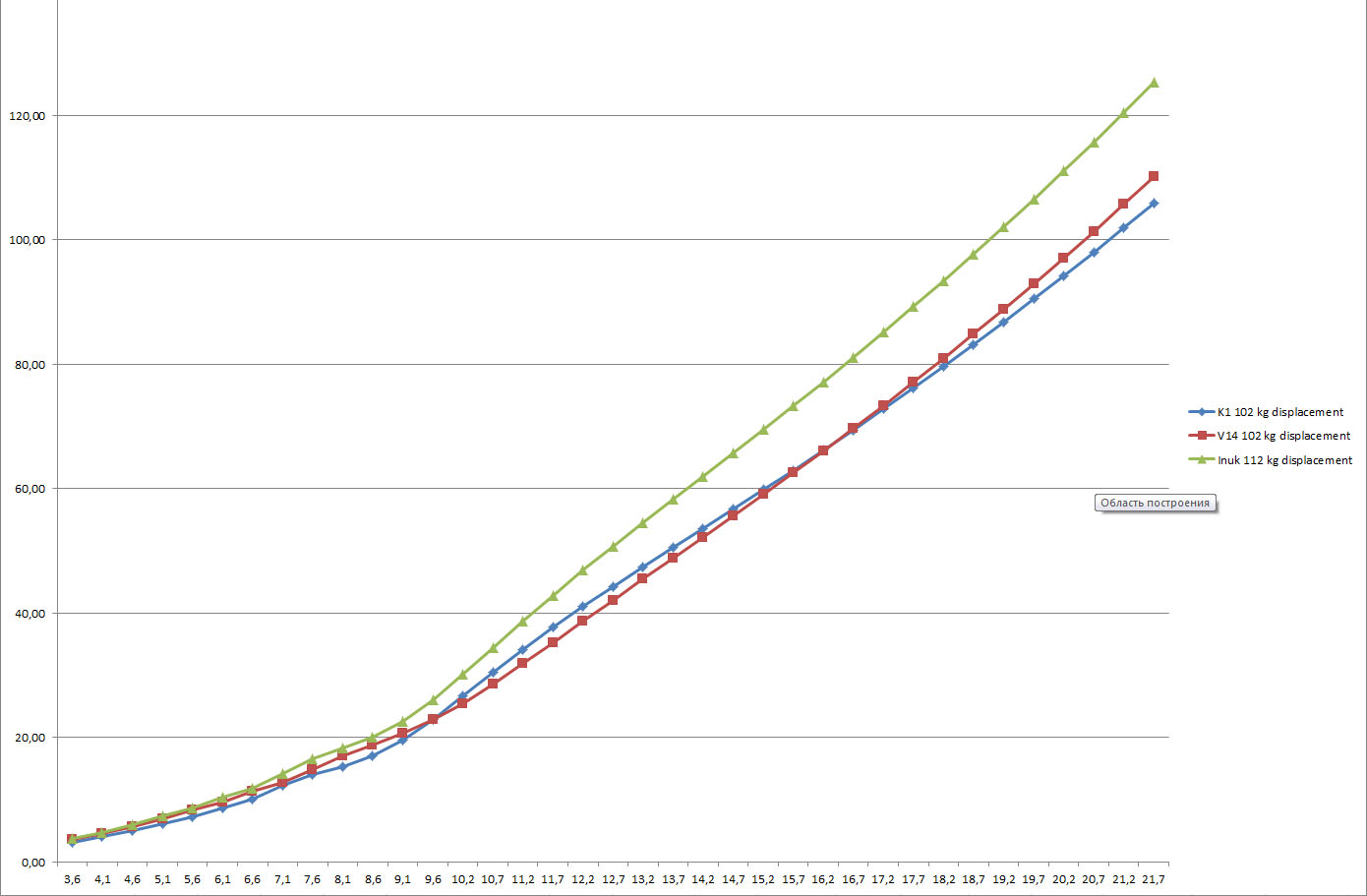 В районе 15 км/ч отличие K1 от Инука будет около 1,2 км/ч по расчетам. В реальной жизни скорее всего больше из-за большего увеличения дифферента у Инука по сравнению с K1. Но все равно разница совсем не такая большая, как многим кажется.