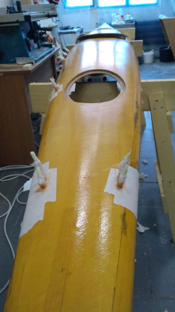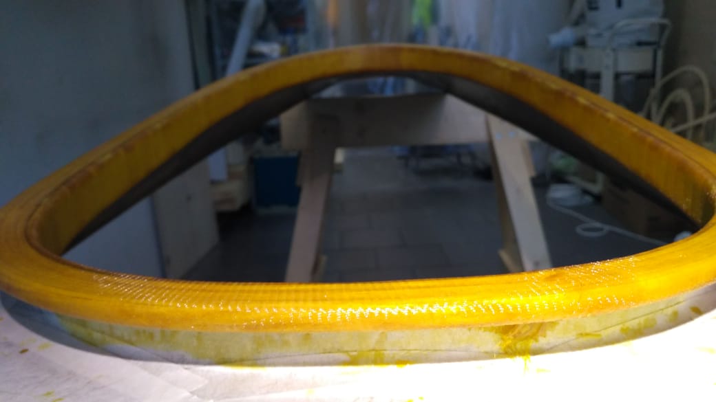 Материал ель, стеклоткань 160 г/м2, смола и шпатлёвка от Эпитал. Вес получился около 22 килограмм, корпус шпатлёван, окрашен Темадур 90 в покрасочной камере.