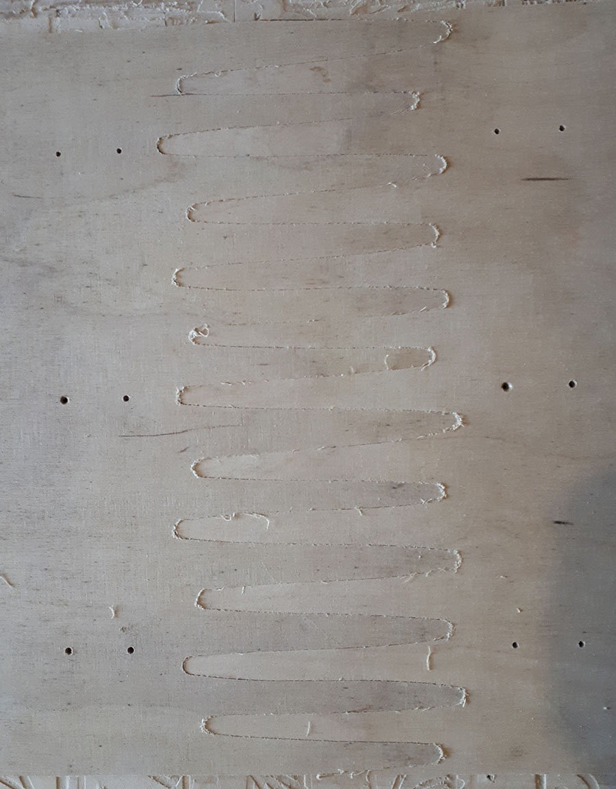 Читал, что нежелательно делать пазловые зубцы с узким основанием, потому что при изгибе эти узкие (пере)шейки начинают ломаться. Поэтому выбрал форму зубцов в виде сглаженных треугольников. Зубцы вырезал ручным фрезером "Фиолент". Диаметр копировальной фрезы - 12 мм.