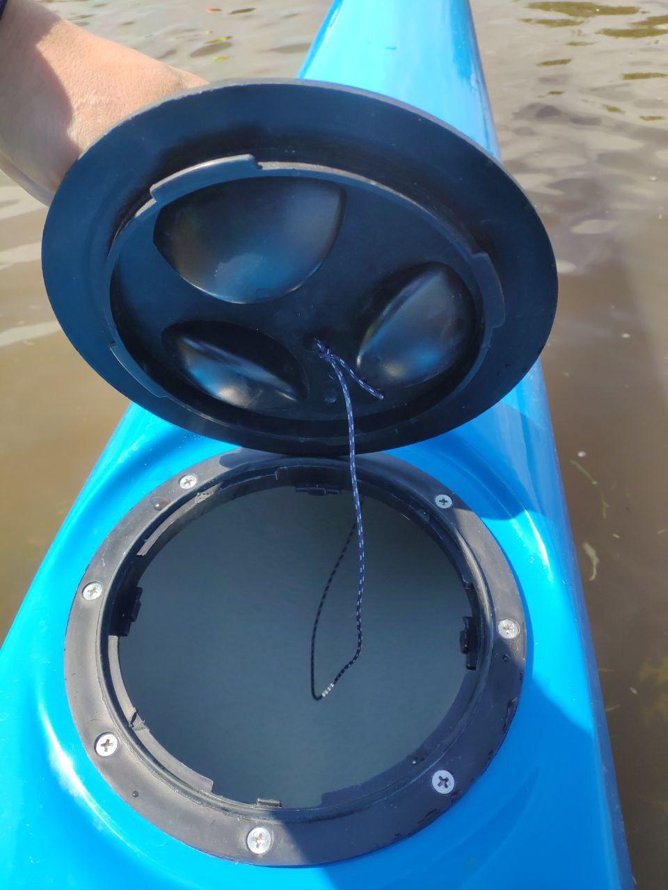 Сляйд приподнят от дна примерно см на 4. Удобно, ягодицы ерзают, жопные кости не давит. При необходимости упираешься в заднюю часть сляйда, там небольшое возвышение. Лодка оборудована двумя люками, один винтовой корма), носовой что-то вроде резьбы, но ход минимальный. Объем естественно небольшой, взять скромный или ультра лайт скарб можно. Из обвязки только на деке немного, есть выемка на корпусе для крепления часов или другого оборудования.