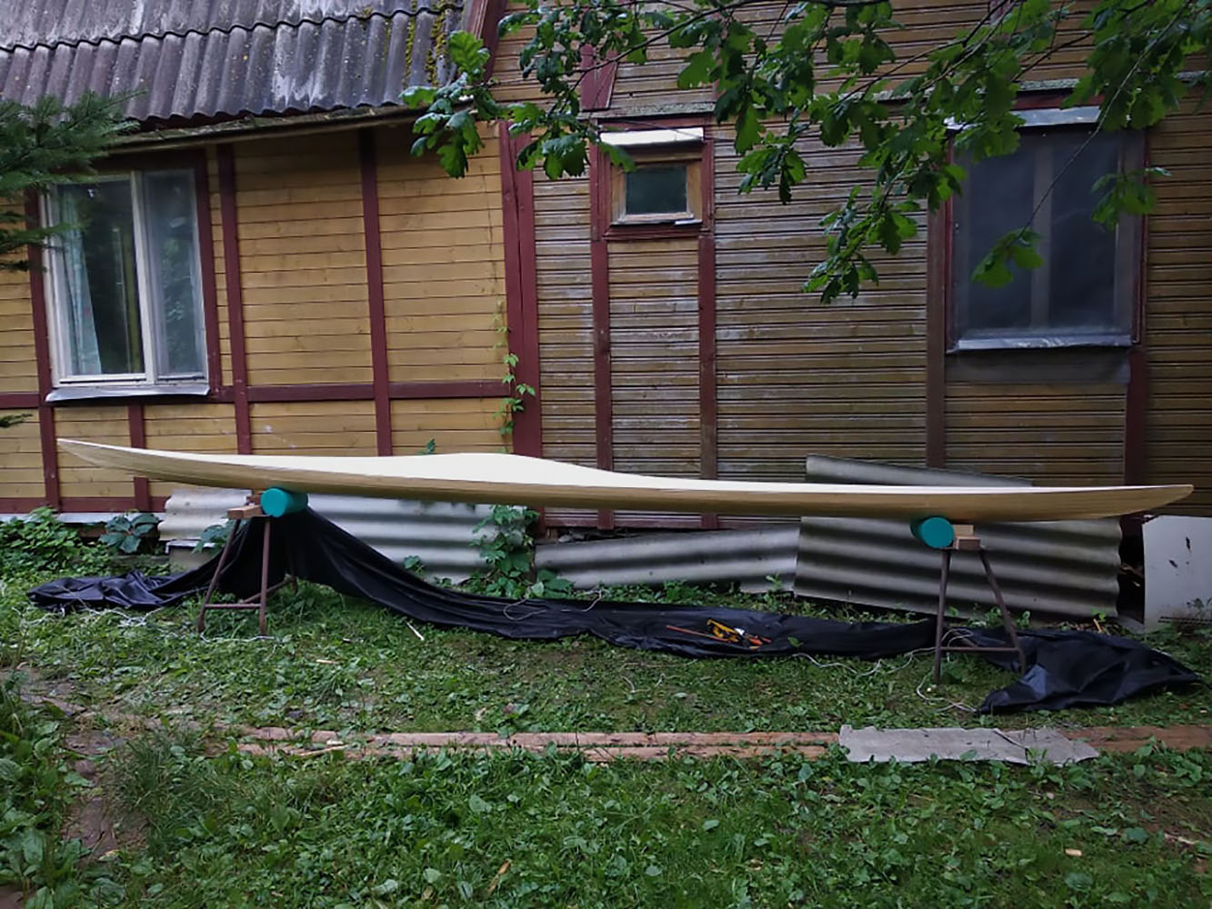 Слежу ) От дождя и солнца закрываю чехлом. Завтра наверное уже буду днище эпоксидкой промазывать. Как-то хочется побыстрее зафиксировать все, что сейчас на скрепках держится )) Я очень надеюсь закончить всю основную работу со смолой до начала осени. То есть иметь две половинки, покрытые стеклом с обеих сторон. Думаю их притянуть друг к другу скотчем и убрать в сарай до весны. Так их не должно повести за зиму. Я надеюсь.