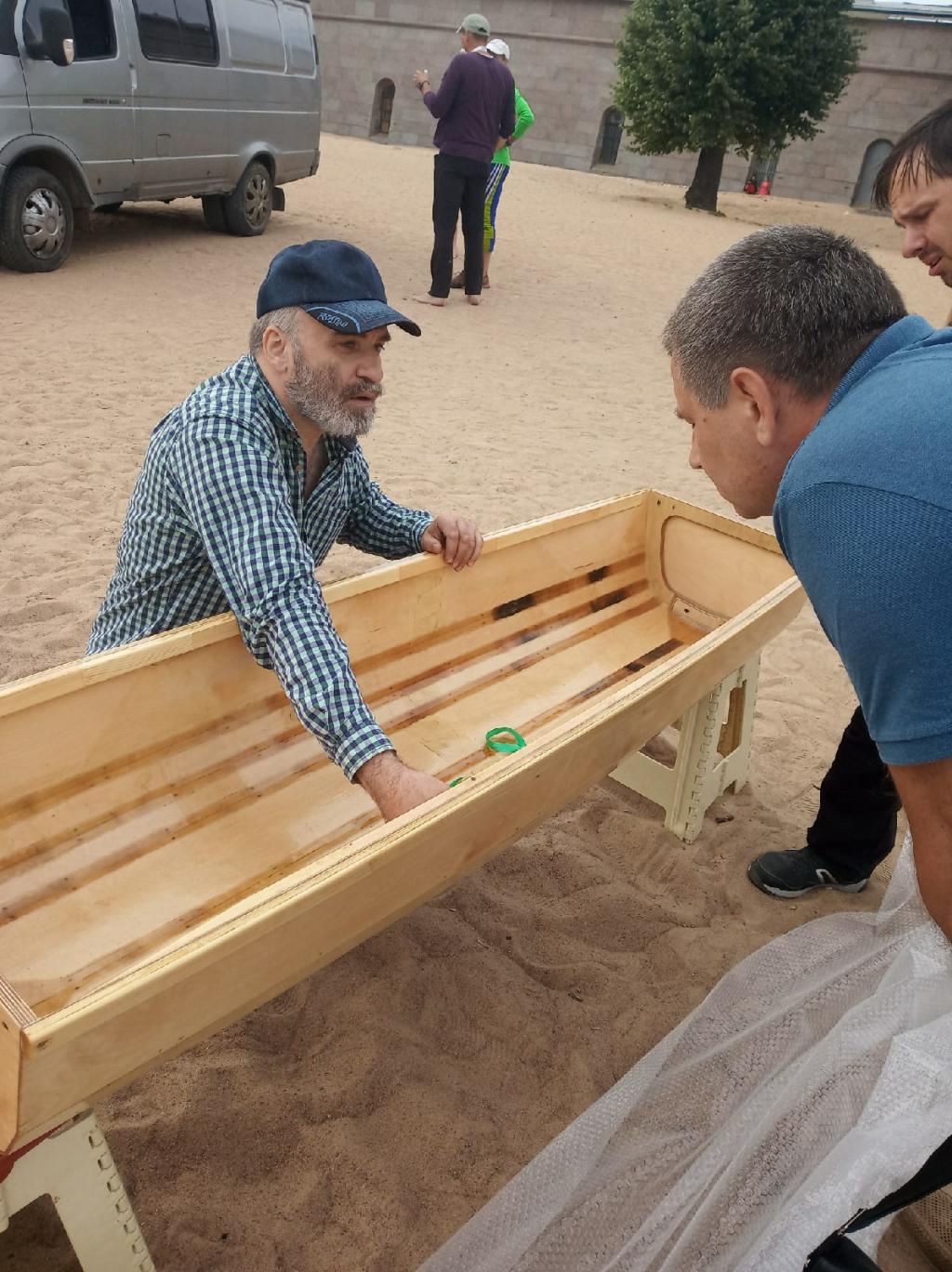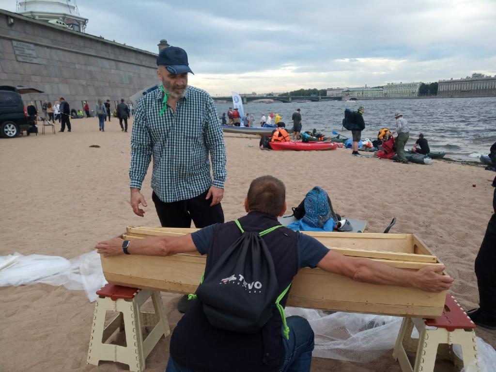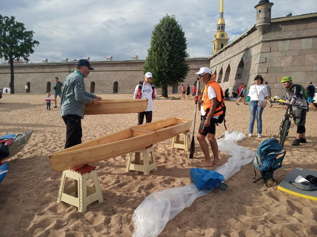 Я на финишной прямой. Лакирую. Осталось прим. 3 - 4 слоя с прошкуриванием. Хотел всё успеть к Петровскому марафону, но не успел. Привёз на показ лодку с единственным слоем лака, нанесённым ночью накануне в ходе дикого аврала. Но показать под лаком было уже не стыдно. В этом году марафон перенескли из - за короновирусной эпидемии с 9 июня на 22 августа. Кабы не этот перенос, и показывать мне было бы нечего. На марафоне резко преобладали тихоходные туристические байдары. Первой к финишу пришла, как положено, узкая и длинная лодка, заточенная под скорость. В марафоне участвовал форумчанин Шкешыр на Розовом Кролике. Беседа с ним запечатлена на посл. фото. Он занял на марафоне какое - то очень хорошее место (не помню какое, но помн6ю, что хорошее). Некоторые туристы пришли на финиш уже в темноте в сопровождении катеров ГИМС. Самодельщиков на марафоне почти не было. Про Шкешыра ч его Розовым Кроликом я уже упомянул. Видел ещё фанерный каяк из 4 - х сегментов. Была интересная лодка в концепции ДОРИ. И больше ничего что то и не припомню ...