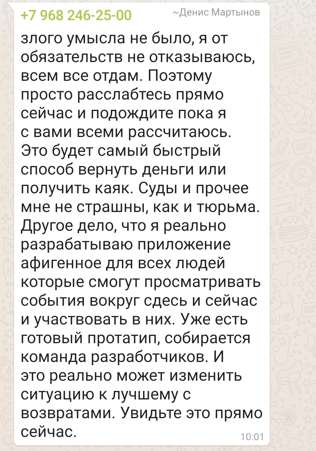 Как видно из переписки некоторые каяки у них есть в наличии, но в группе вотсапа информация противоположная - в наличии нет. Что вполне объяснимо: зачем раздавать оплаченные год назад, полгода назад каяки (деньги та уже просажены), если можно за эти каяки получить реальные деньги. Таки продается тот самый Новороссийский контейнер каяков! Каяки просто-напросто продаются второй раз :yes: