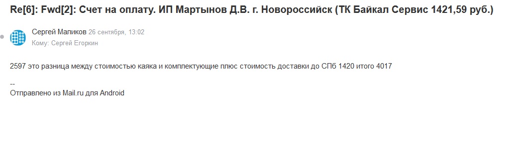 Далее расчет прост: разница между суммой оплаченного каяка и комплектующих (2 600р без малого) + стоимость доставки (1400р с копейками) итого на возврат 4000руб