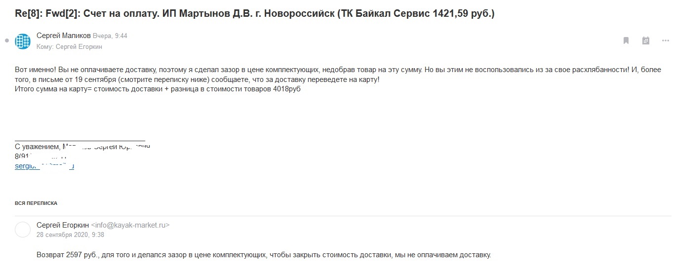 Пишу Егоркину, говорит деньги за доставку вернем на карту: Далее расчет прост: разница между суммой оплаченного каяка и комплектующих (2 600р без малого) + стоимость доставки (1400р с копейками) итого на возврат 4000руб