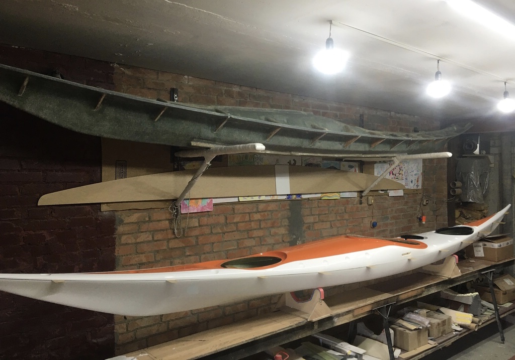 Получается легче, но пока лодка не будет готова, не ясно на сколько. Это только две половинки не склеенные. Деку оставили без изменений, нижнюю половину укрепили только по днищу с небольшим нахлёстом. В первой лодке полностью всю нижнюю половину укрепляли. У нас пока только ручная формовка, поэтому есть ограничения по материалам. В ответственные места в серцевину ставим coremat. На этот раз взяли единичку вместо двойки. Жёсткость получилась достаточная, деку и дно не продавить. Сиденье я этот раз хочу полегче сделать. По мелочам много веса набирается. Посмотрим, что получится. Если будет до 25 — уже хорошо. Чтобы легче делать, нужно вакуумную инфузию и другие материалы. Мы пока не потянем. Но надеюсь со временем освоим.
