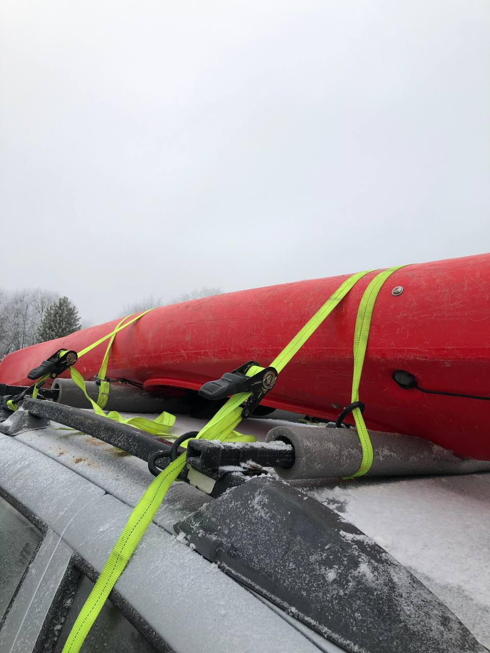 3. Если багажник хреново прикрепить к релингам, то каяк уедет назад вместе с передней перекладиной багажника.. Так делать не надо)))
