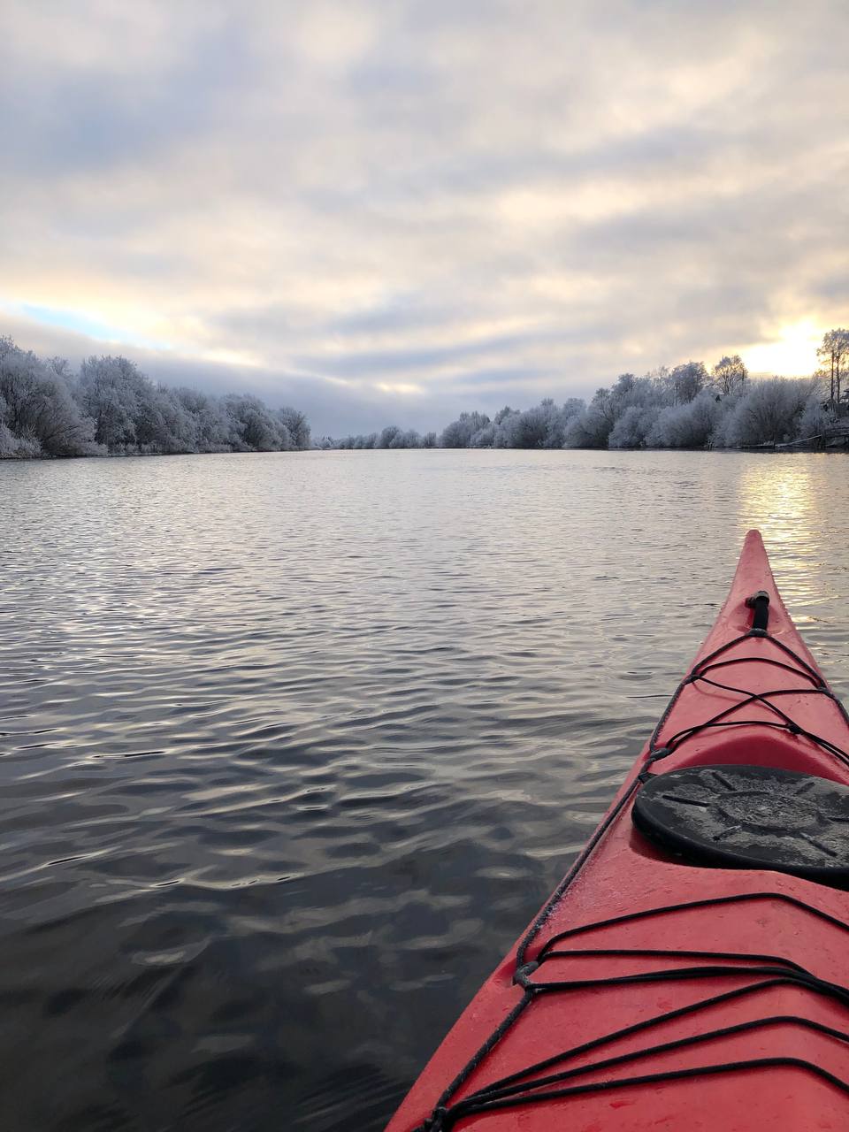 Исходные данные: Вода +1 - +2, воздух -1. Первая половина пути почти штиль, обратно ветер 2.5 - 4 м/с. Задача - потестировать одежду и каяк в холодную погоду.