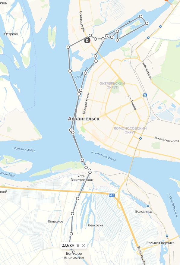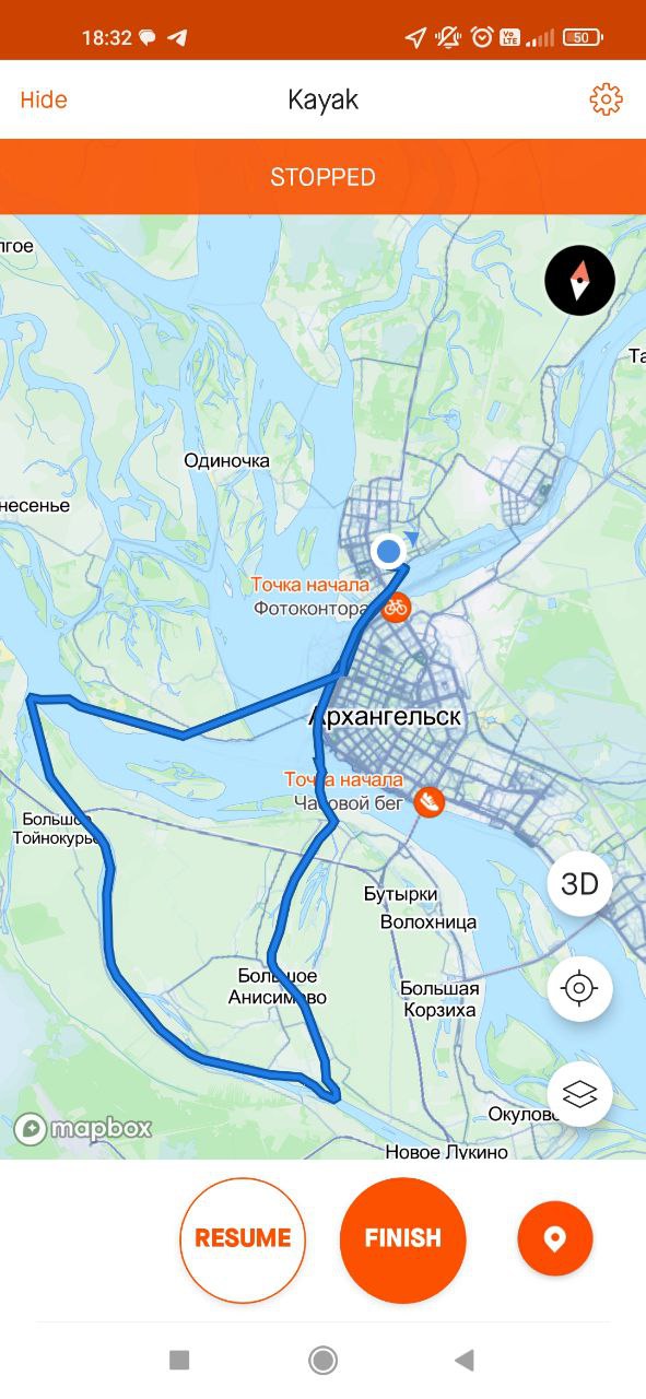 4. Обогнул все острова и пошел обратно. Тут сразу попал в снежный заряд - ветер в лицо со снегом, волна. В центре города на базе МЧС отдохнул, попил чаю и уже двинулся обратно в Заостровку. Прошел до Анисимово, где меня забрали. Маршрут прикрепил. По итогу - каяк и вся одежда обмерзли, нужно утепляться) Я проверил одежду, каяк и силы в экстремальных условиях и очень доволен.