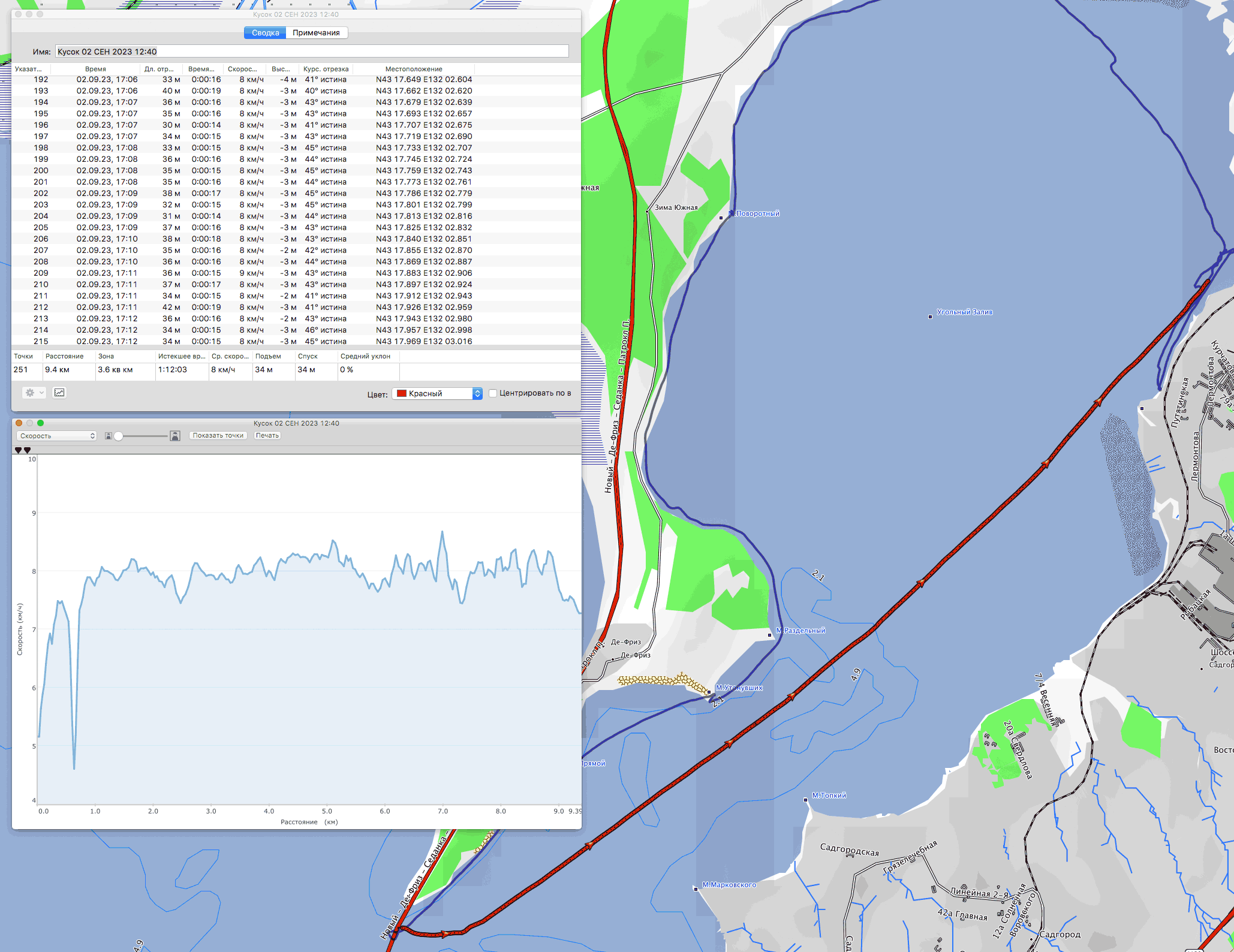 И на обратном пути постарался спланировать прямой участок маршрута и поддерживать на нем максимальную скорость. На отрезке пути 10 км получилась средняя скорость 8 км/ч.