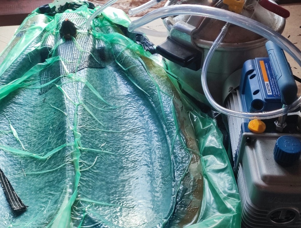 В этих вакуумных делах надо обеспечивать полный выход воздуха по всей площади-делается разными подкладками-дырявыми, напитывающимися и тд. И не всегда визуально проконтролируешь-особенно с мешком уже намазанный ламинат. Тут люди с целой лодки Вивье оклеенной все сдирали - неудачно наклеили всего 1 слой и пошел весь пузырями. ПС уже про прокладки и написали