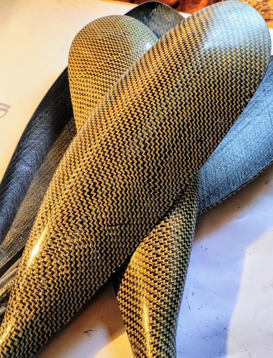 Использовать гибрид карбон-кевлар для весла смысла нет, в техническом плане. Вот для корпуса каяка есть смысл, а для весла это только видовой слой, чтобы было красиво. Конечно свою функцию, как армирующий слой он выполняет, но главное тут видовой момент, чтобы было красиво. А на фото, даже обидно. Ну чего так не аккуратно то? Форма простая, укладывать легко. Разложил ткань на столе, расправил все ниточки, тоненько пролил клеем. Подождал полчаса, всё ткань закрепилась, нитки не расползаются. Дальше в матрицу брызнул тоненько линию по центру, уложил ткань, отогнул одну половинку, брызнул, прикатал, отогнул воторую половинку, брызнул, прикатал. Получил результат. Конечно, кривые нитки на качество композита не влияют, но...