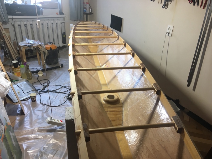 Развенчивать тупые мифы задолбало. На все предъявы вроде адекватно отвечено. Кто не понял, ничем более помочь не могу. Всем пока. Если автор хочет сертифицированную "К1", его право. Я сам не хочу. Плинтусную технологию пока отрабатываю на наветренном аутриггере тихоокеанского проа. Только он как раз будет стоять на ребре (для мореходности). Каноэборд будет более похож на обычную лодку типа канадского каноэ с сильно скруглёнными днищевыми скулами. На фото - верхняя часть плинтусного аутриггера, перевёрнутая вверх ногами. Сечение в миделе 400 Х400. Длина - 5133 мм. Кабы не другие функции, то было бы очень похоже на гребную лодку типа "ЮКОНСКАЯ ШАРПИ". Для каноэборда сделаю мидель 320 Х 235, причём ВЛ и килевая линия будут абс. идентичными. Скругление плинтусов на аутриггере не предусмотрено, ибо при этих обводах нет перетока через рёбра. Для лодки же надо сделать радиус не менее 50 мм. Пока ничего страшного в плинтусной технологии не увидел. Только одни плюсы. Фанера - сейба, плинтуса - из абаши. Подветренный аутриггер планирую сделать надувным, поскольку он нужен чисто для страховки. Как вариант, страховочный подветренный аутриггер можно выполнить в виде каноэборда. Тогда он тоже будет плинтусным, но на ребре стоять уже не будет. Насыщение корпуса силовыми диагоналями для речной лодки тоже не нужно. Это будет обычный монокок. На все сиякерские традиции мне глубоко наплевать, я никакие обязательства кровью не подписывал. И другим не советую. Чтобы получить 28 - 30 ньютонов на реке, не надо так изощрённо изголяться, как вы изголяетесь. Вас обманули.