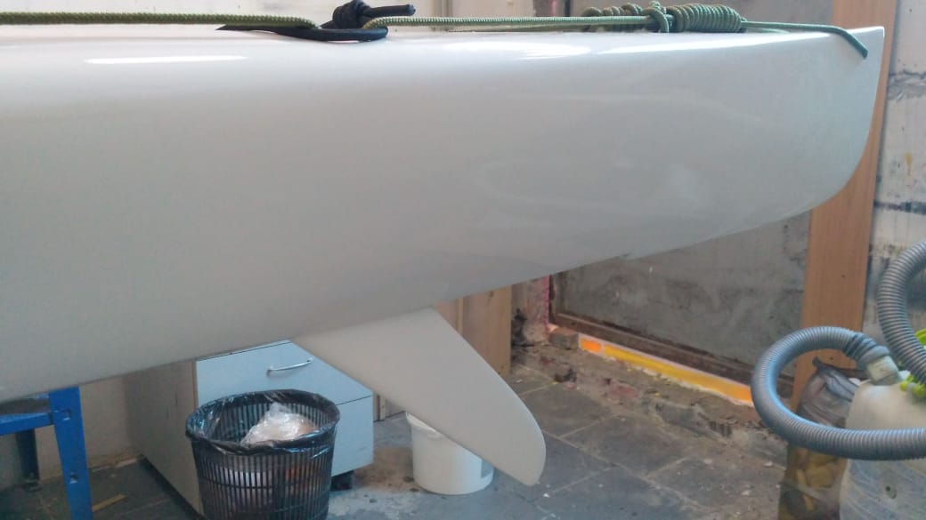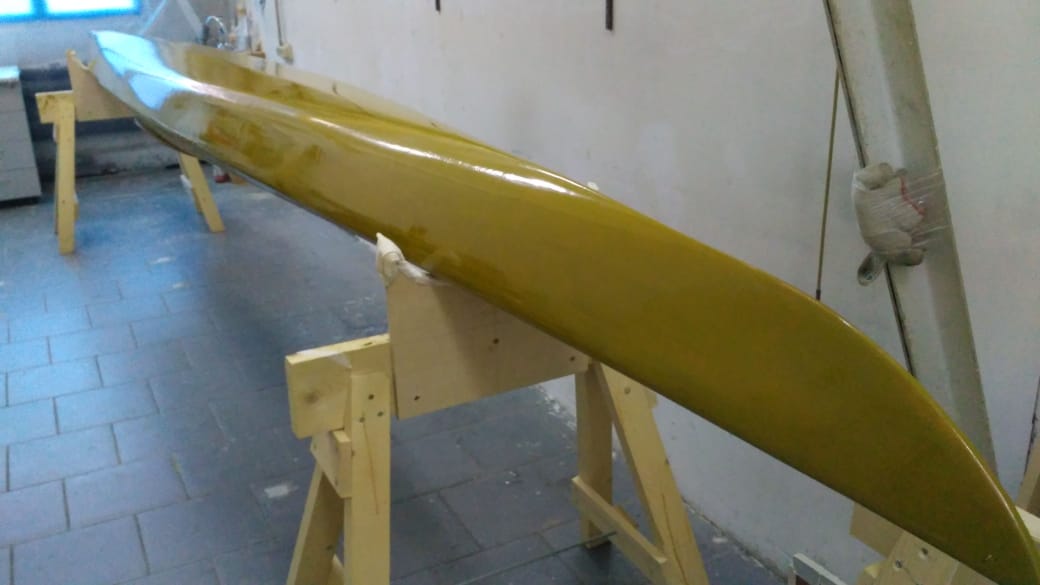 Материал ель, стеклоткань 160 г/м2, смола и шпатлёвка от Эпитал. Вес получился около 22 килограмм, корпус шпатлёван, окрашен Темадур 90 в покрасочной камере.